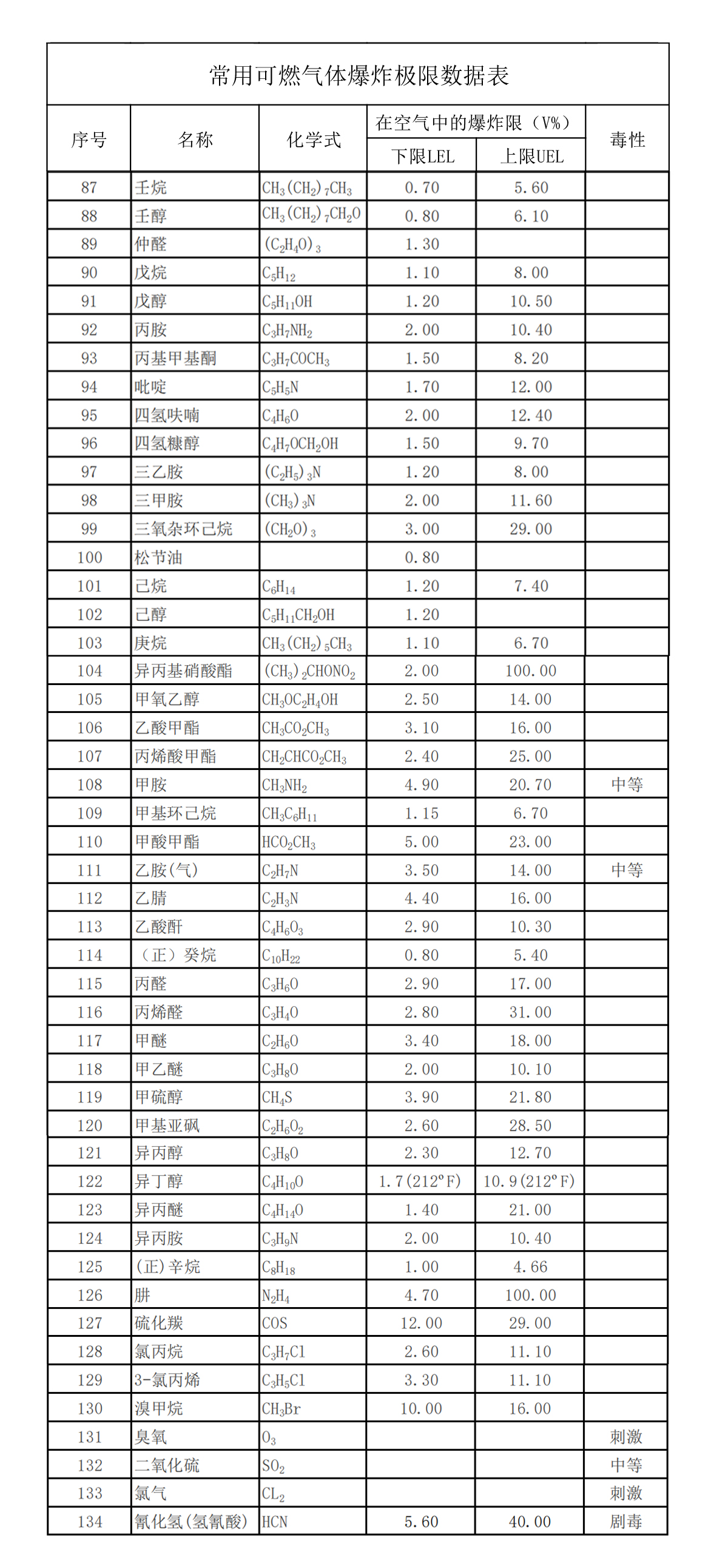 常用可燃?xì)怏w爆炸極限數(shù)據(jù)表(三)